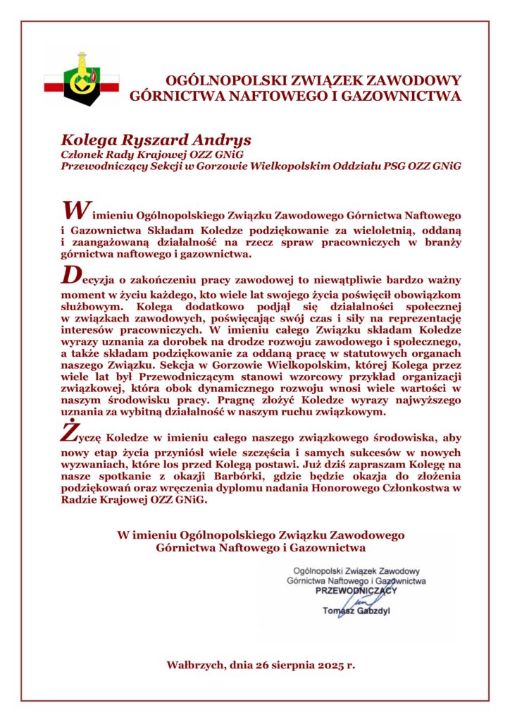 Ryszard Andrys - Podziękowanie - Ogólnopolski Związek Zawodowy Górnictwa Naftowego i Gazownictwa