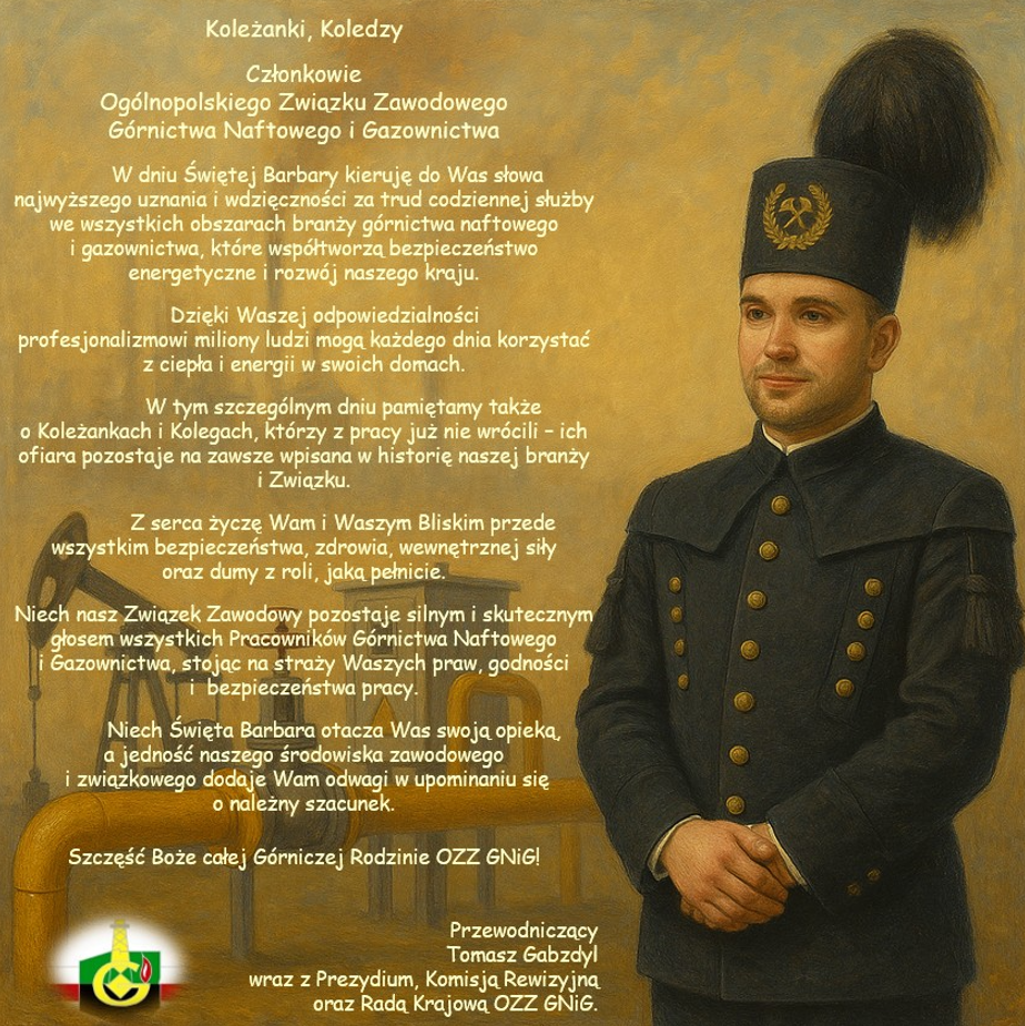 Życzenia z okazji Święta Barbórki od Przewodniczącego Ogólnopolskiego Związku Zawodowego Górnictwa Naftowego i Gazownictwa - Ogólnopolski Związek Zawodowy Górnictwa Naftowego i Gazownictwa